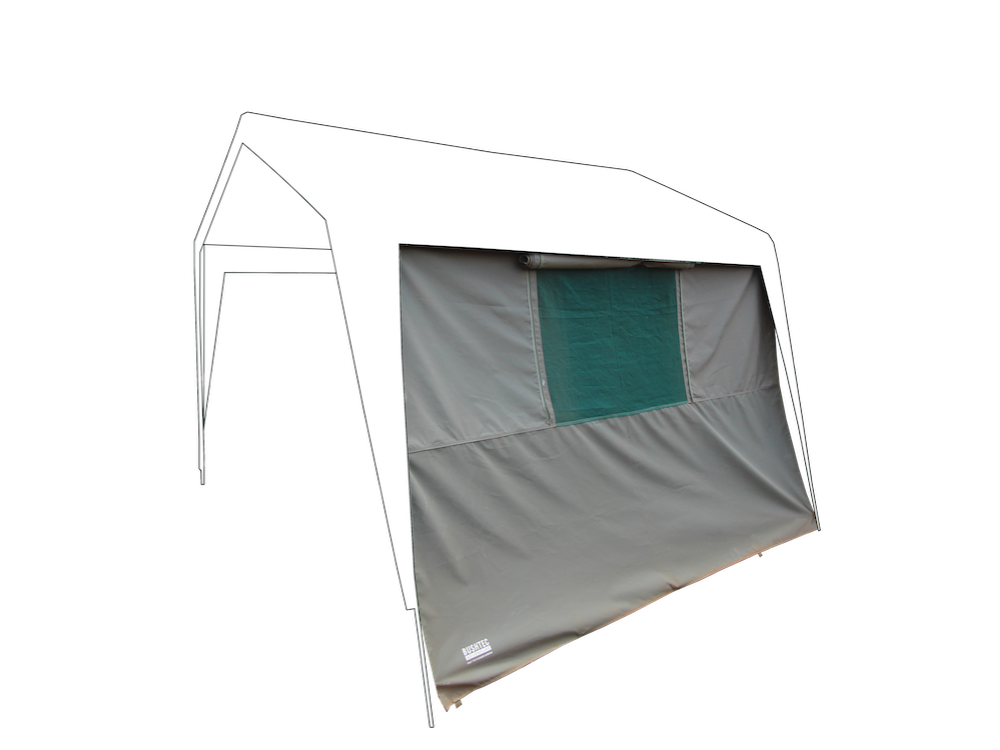 Der Pavillon von Meerkat kann mit Seitenwänden erweitert werden. Diese Seitenwand mit Fenster wird ganz einfach mitteles Klettverschluss am Pavillon befestigt.
